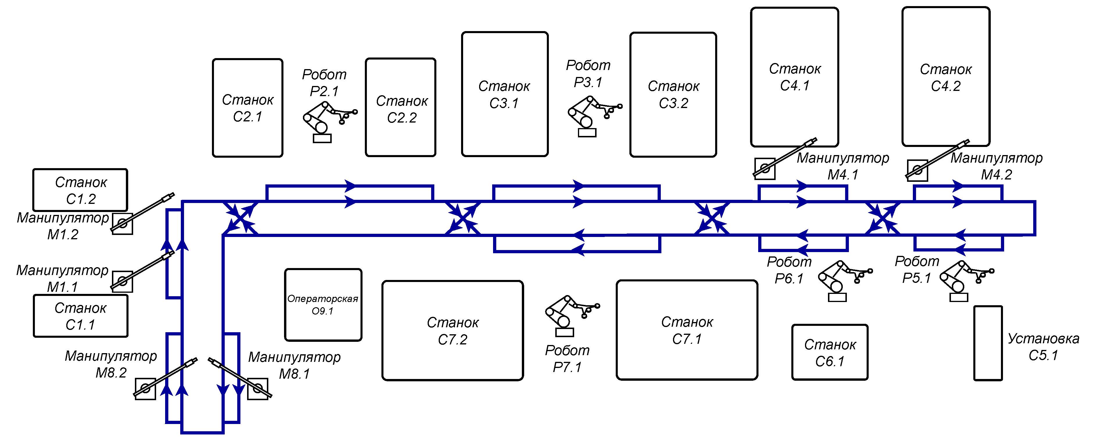 - Транспортные системы — конвейеры, роботы, тележки, обеспечивающие перемещение заготовок.