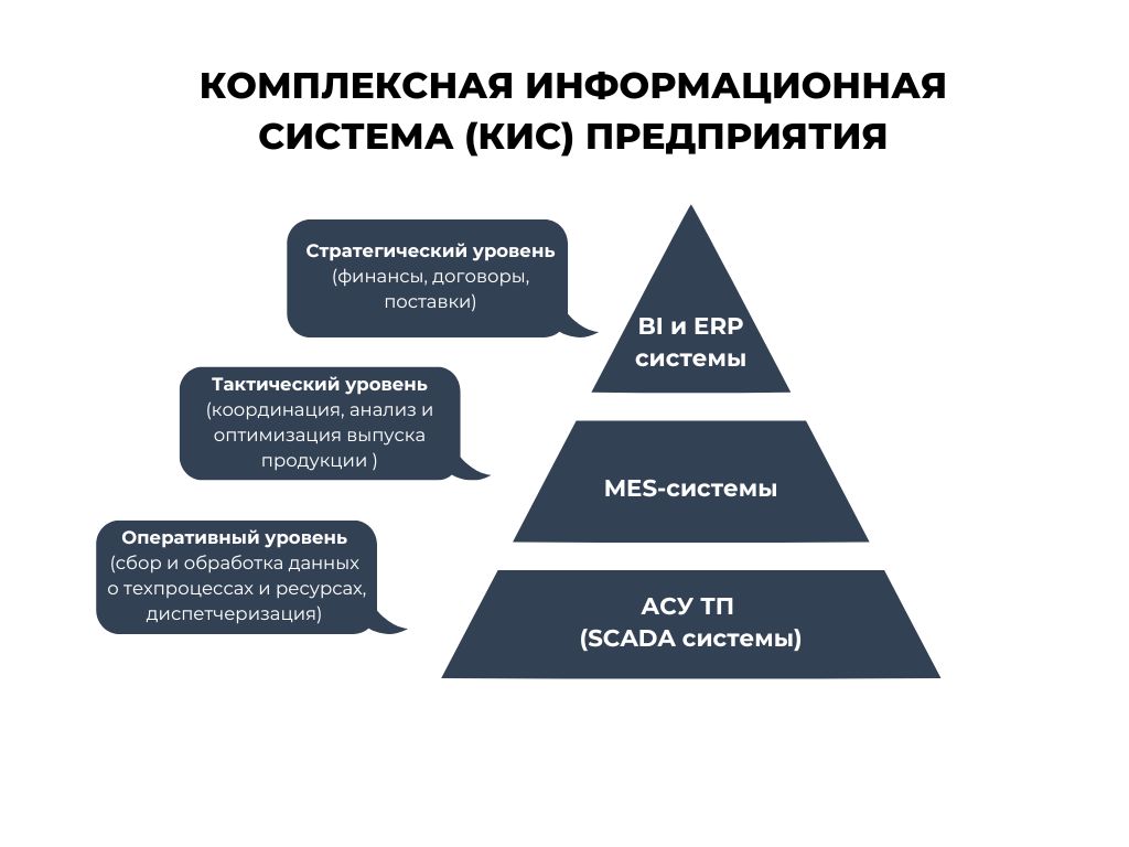 Системы автоматизации (BI, ERP, MES, АСУ ТП) и уровни управления можно соотнести. Системы вида BI (Business intelligence) и ERP определяют стратегический уровень управления, MES-системы задают тактический уровень, а АСУ ТП (SCADA системы) – оперативный. Представленную иерархию управления называют комплексной информационной системой (КИС) предприятия.